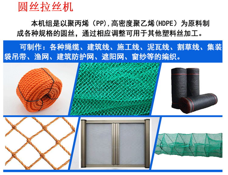 扁絲拉絲機 該生產線是以聚丙烯(PP)、高密度聚乙烯(HDPE)為原料制成的各種噸袋、編織袋、遮陽網、蓋土網、繩子等用絲。