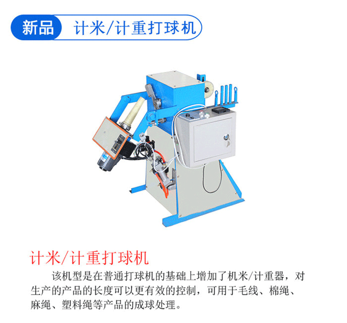 計米/計重打球機 該機型是在普通打球機的基礎上增加了計米/計重器,對生產的產品的長度可以更有效的控制,可用于毛線、棉繩、麻繩、塑料繩等產品的成球處理。